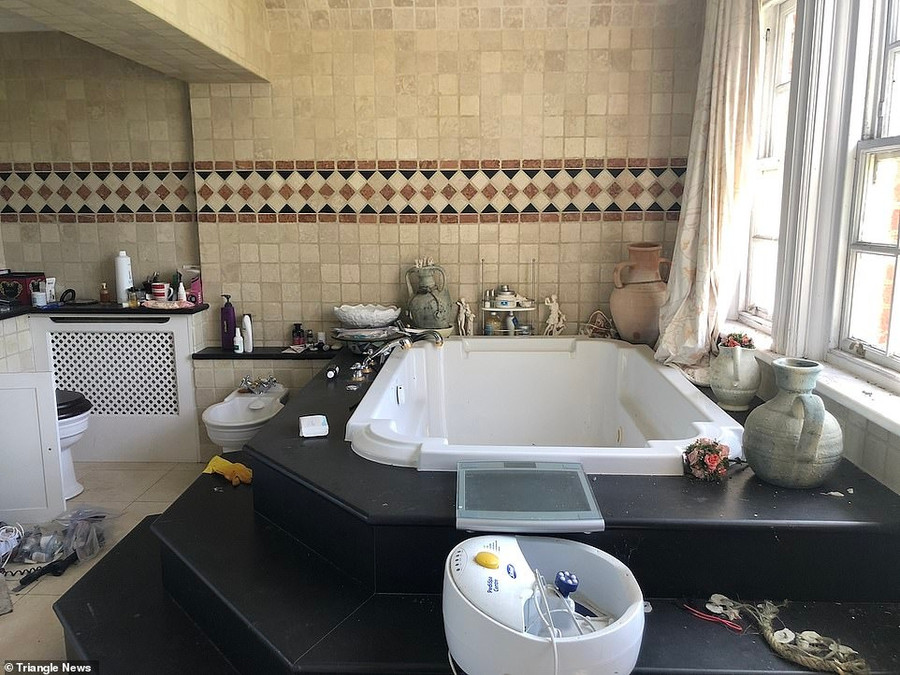 | Bồn tắm kiểu bể sục giúp chủ nhân căn biệt thự thư giãn sau ngày dài mệt mỏi. Người này vẫn để lại một số thiết bị, đồ dùng dang dở. |