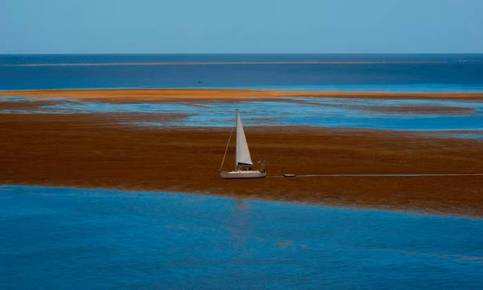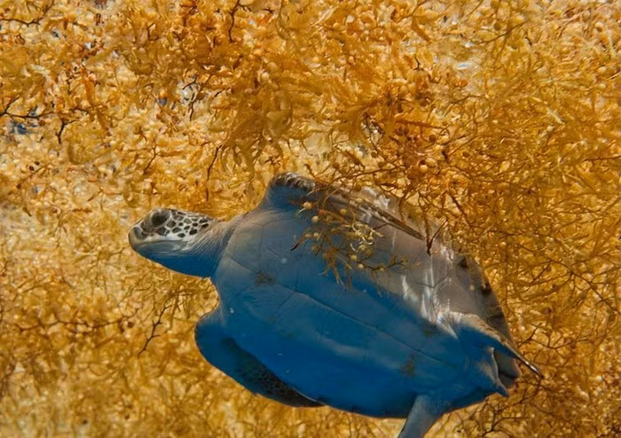 Ngoài ra, tại đây, bạn có thể chiêm ngưỡng cảnh tượng rong biển dày đặc, tạo thành tấm thảm trên bề mặt bao phủ vùng nước rộng lớn. Đây là một hiện tượng kỳ lạ không nơi nào khác có được trên thế giới. Rong biển màu nâu vàng này được gọi là Sargassum. Ảnh: Geography and You.