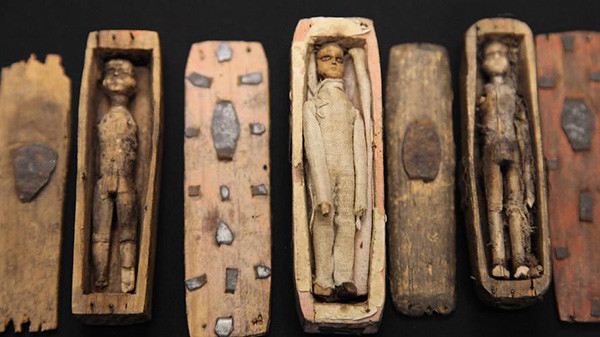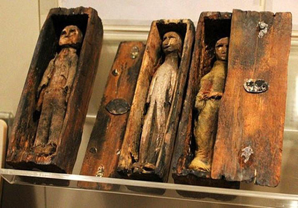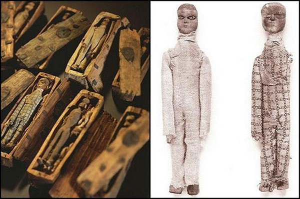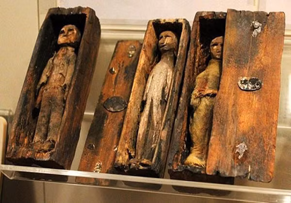 Số “xác ướp” đặc biệt này gây chú ý khi có kích thước chỉ dài khoảng 10 cm và được đặt trong từng cỗ quan tài tương ứng. Điều thú vị là mỗi hình nộm khoác trên người trang phục tỉ mỉ giống như may đo cho người thật.