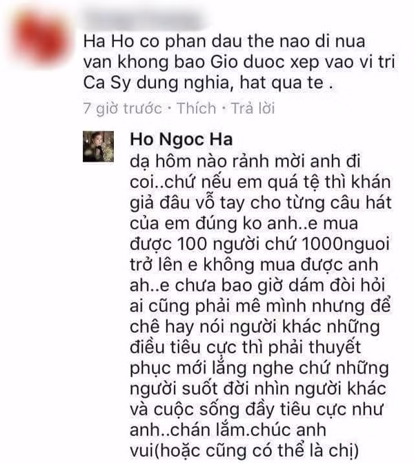 Tuy nhiên, bên cạnh những bình luận tích cực thì cũng có một số anti-fan cho rằng, Hà Hồ có phấn đấu thế nào đi nữa thì vẫn không bao giờ được xếp vào vị trí ca sĩ đúng nghĩa vì hát quá tệ. Trước bình luận không thiện chí của anti-fan nữ ca sĩ chọn cách "đáp trả" thẳng thắn: