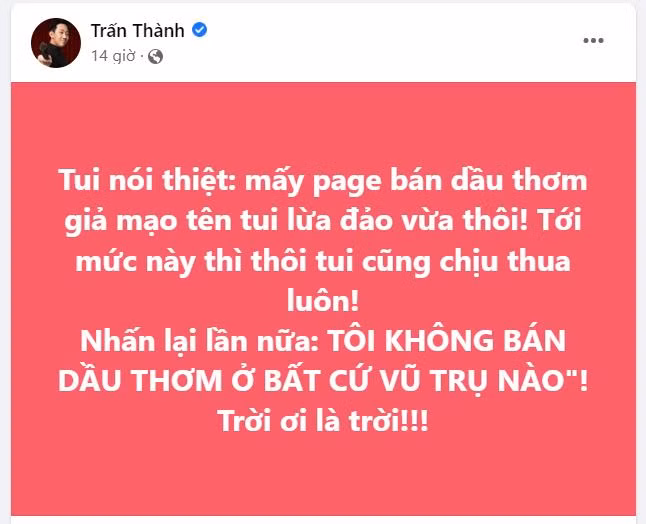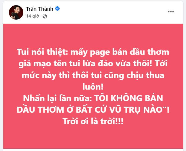 Trấn Thành viết: "Mấy page bán dầu thơm giả mạo tên tui lừa đảo vừa thôi! Tới mức này thì thôi tui cũng chịu thua luôn! Nhấn lại lần nữa: Tôi không bán dầu thơm ở bất cứ vũ trụ nào"! Trời ơi là trời!".