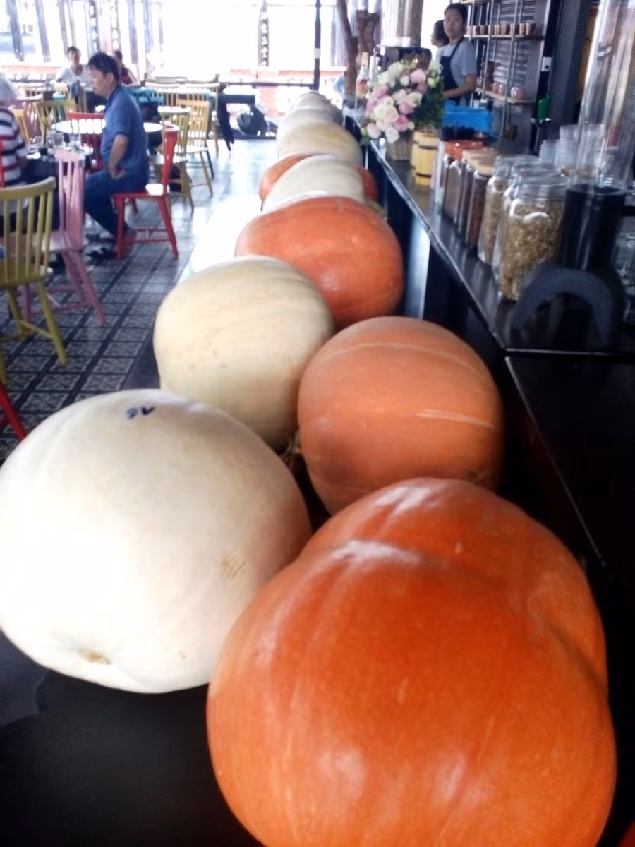 Đến nay quán đã nhập về hơn 20 trái và được bố trí trong không gian quán để khách vào tham quan và chụp hình. Mỗi trái bí ngô có thể trưng bày rất lâu, có khi lên đến 3 - 4 tháng vẫn còn nguyên vẹn.
