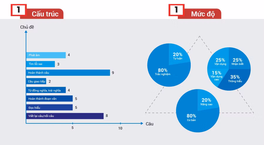 Số lượng câu hỏi liên quan đến ngữ pháp (đơn lẻ, trong đoạn văn điền từ, vận dụng viết câu) chiếm tỷ lệ tương đương 50%, trong khi số lượng câu về từ vựng ít.
