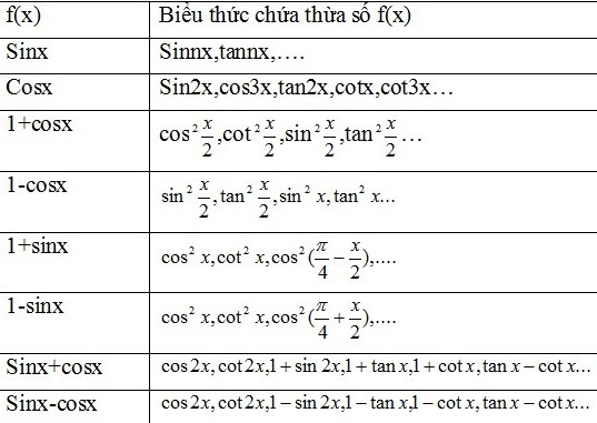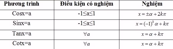 Do tính tuần hoàn của các hàm số lượng giác y =sinx, y =cosx, y =tanx, y =cotx nên khi đó biến một nghiệm của phương trình lượng giác cơ bản, ta biết tất cả các nghiệm của phương trình theo bảng dễ nhớ sau: