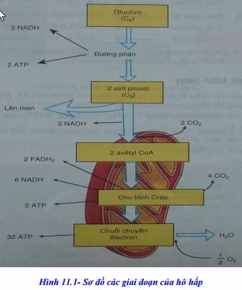 Quan sát sơ đồ từ trái qua phải chỉ ra sản phẩm của hô hấp: Trong đường phân, biến đổi glucôzơ thành axit piruvic tạo NADH và ATP. Chu trình Crep tạo các sản phẩm NADH, FADH2, ATP, CO2 Chuỗi chuyền electron hô hấp sinh ra ATP, H2O