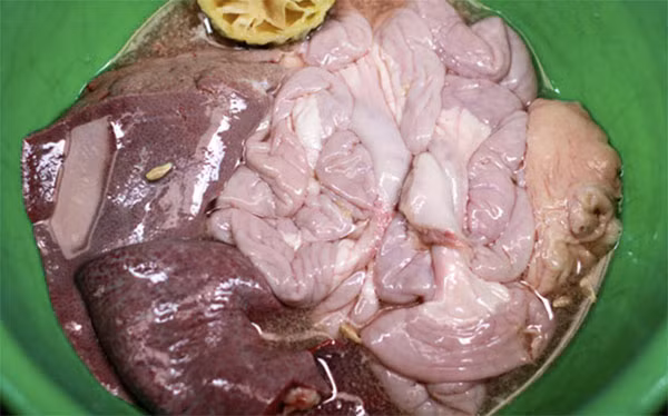 Phần lưỡi lợn, bạn đem rửa sạch và bóp kỹ với chanh, dấm, muối cho sạch mùi hôi. Phần lòng lợn và các phần phủ tạng khác, bạn cũng thực hiện tương tự.