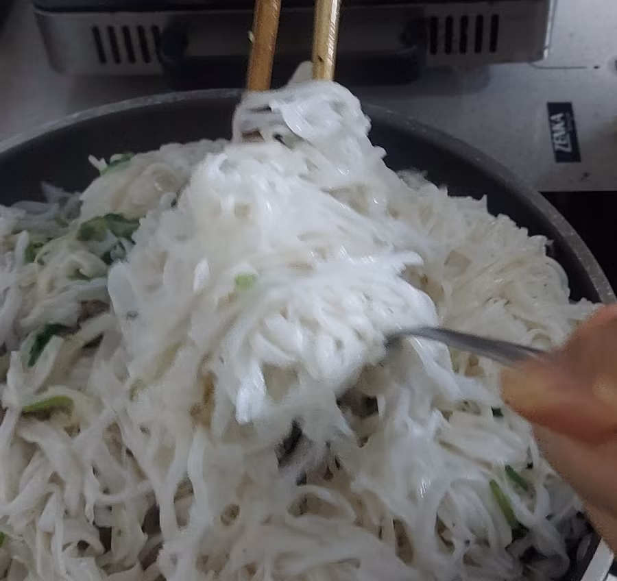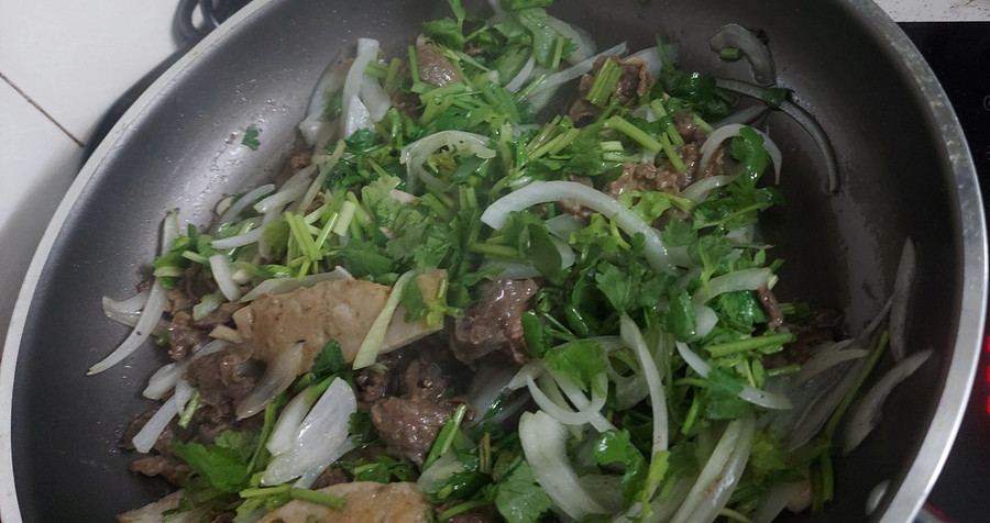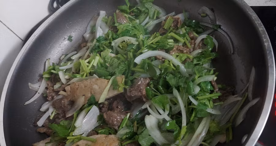 Thêm hành tây thái giống hình trăng khuyết, nhúm cần tây xanh mướt rồi mới cho phở tươi vào đảo đều chừng vài phút là có thể thưởng thức. Để hạn chế dầu mỡ, chảo xào phải là loại chống dính.