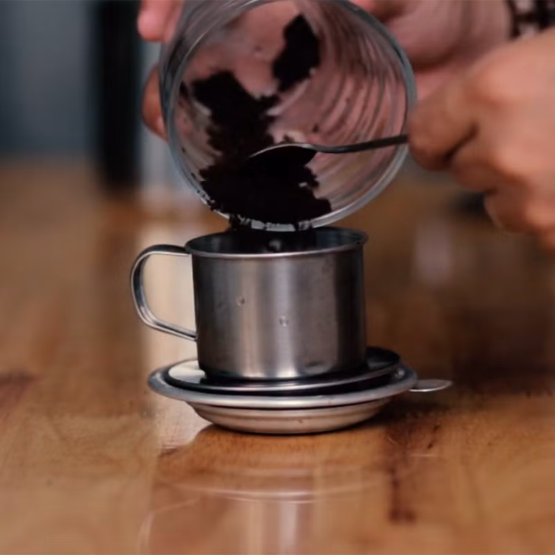 Bước 2: Bạn cần cho 3 muỗng bột cà phê nguyên chất vào phin. Đặt phin lên trên ly thủy tinh và tiến hành ép bột cà phê với lực vừa phải.