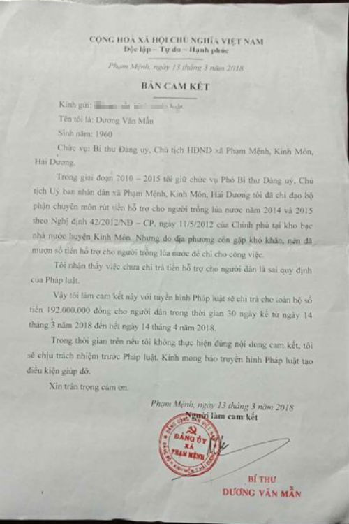 Vào ngày 13/3 ông Dương Văn Mẫn, Bí thư Đảng ủy, chủ tịch HĐND xã Phạm Mệnh, huyện Kinh Môn (tỉnh Hải Dương) đã tự tay viết bản cam kết nhận sai phạm khi trước đó đã rút tiền hỗ trợ người dân trồng lúa của Chính phủ.