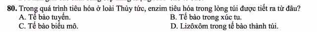 Theo ông Thuật, ở câu 80: “Trong quá trình tiêu hóa ở loài Thủy tức, enzim tiêu hóa trong lòng túi được tiết ra từ đâu?