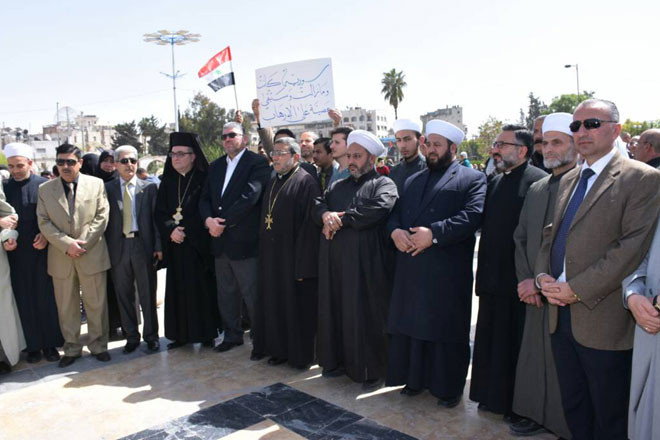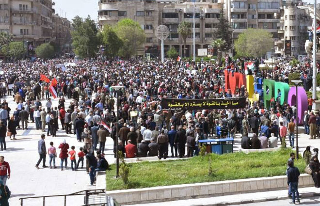 Cuộc biểu tình quy mô lớn diễn ra bên trong quảng trường Sa’adallah Al-Jabiri của thành phố Aleppo. Đám đông này cũng ủng hộ chính phủ Syria.