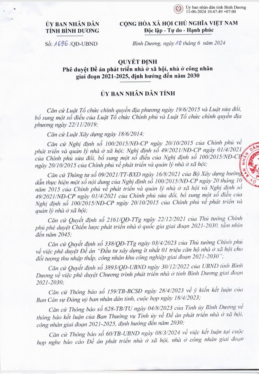 | Quyết định số 1696/QĐ-UBND phê duyệt Đề án phát triển nhà ở xã hội, nhà ở công nhân của UBND tỉnh Bình Dương. |