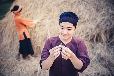 Trang phục của cô dâu - chú rể được làm cũ đi cho thật tự nhiên, các đạo cụ chụp ảnh như chiếc xe đạp, gàu tát nước, chú trâu... đều được mượn, thuê tại địa phương.