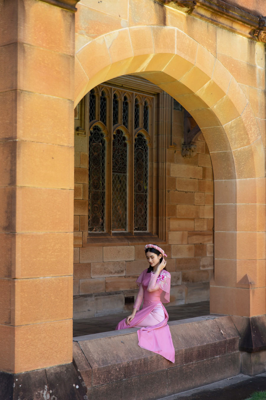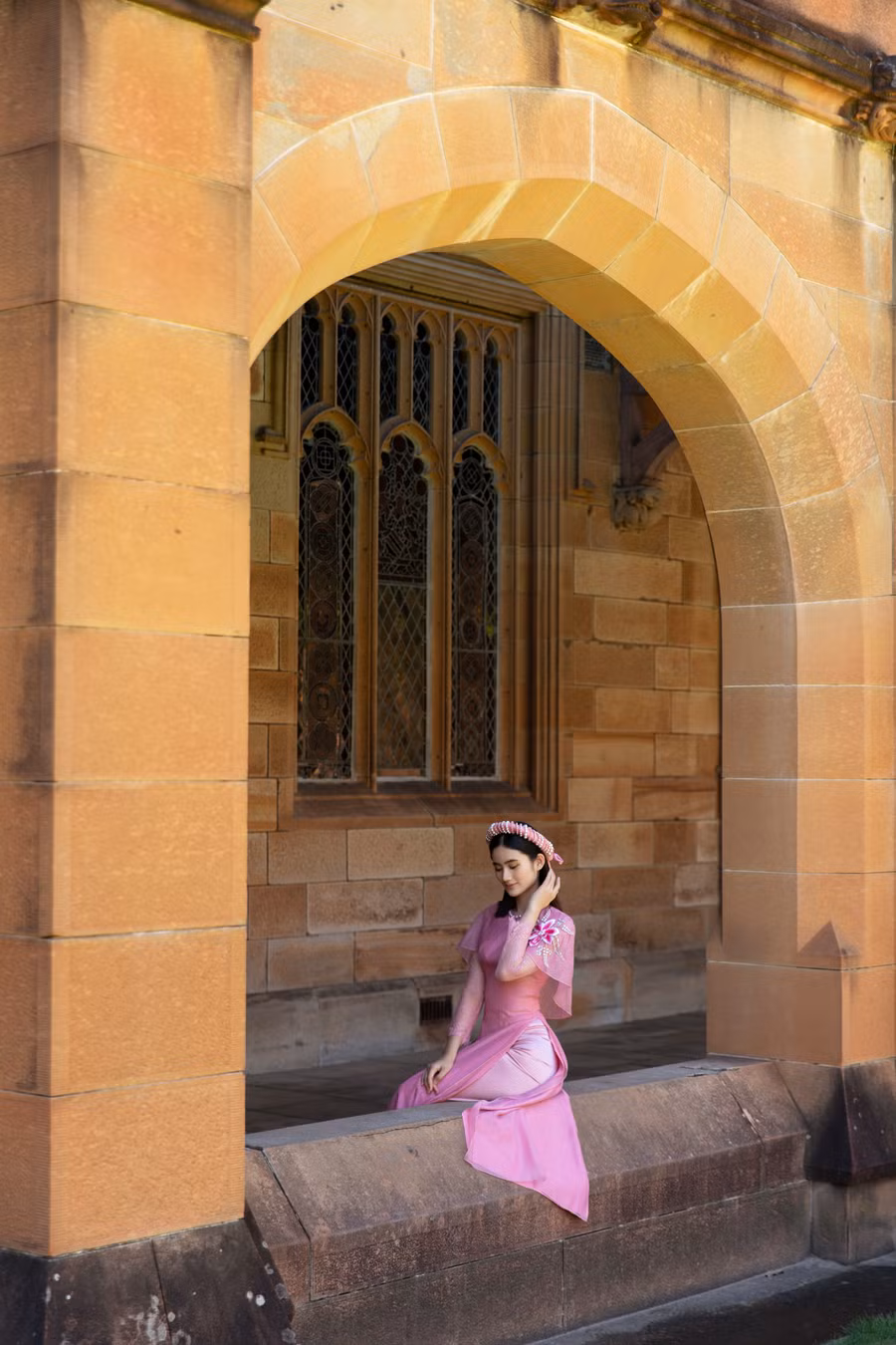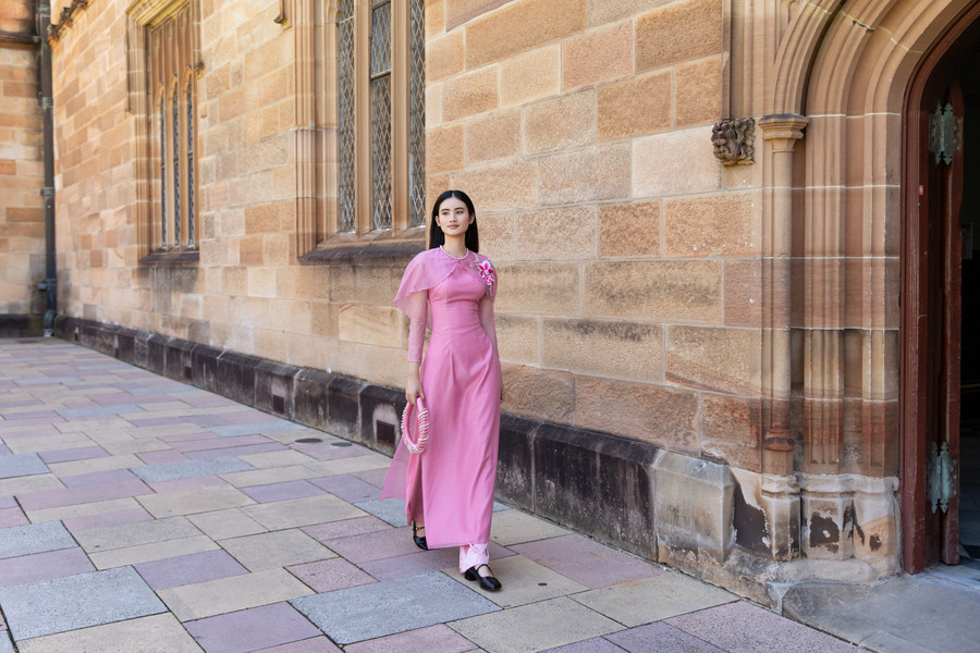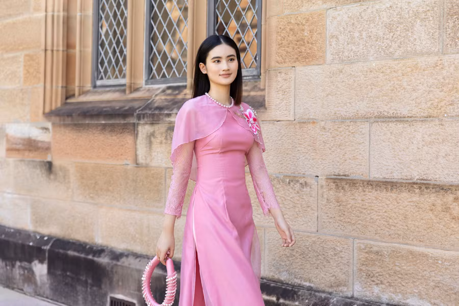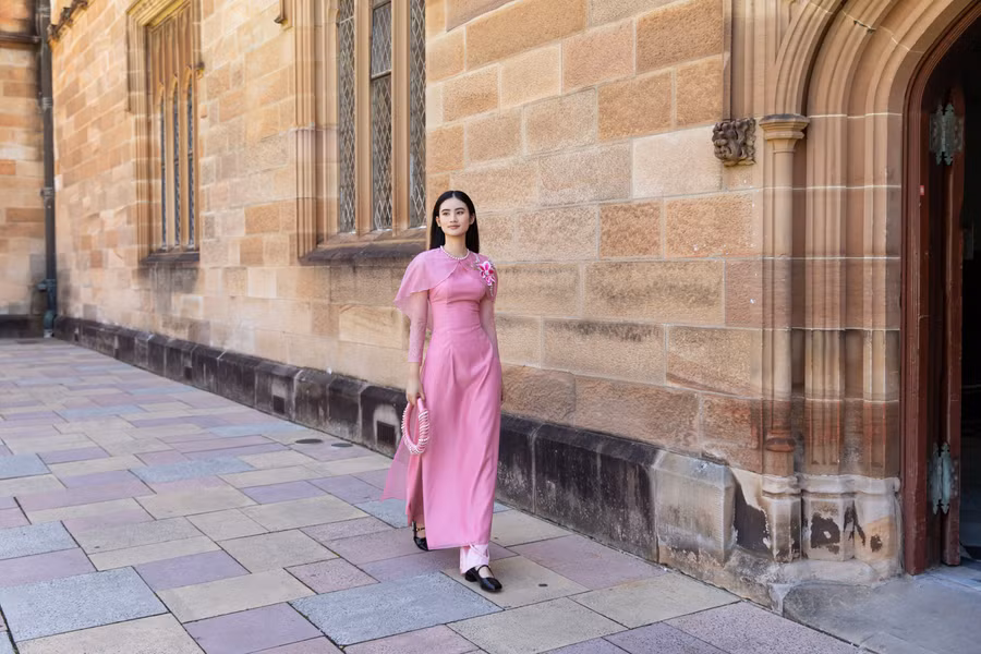 Hình ảnh cô sinh viên Việt Nam nền nã trong tà áo dài hồng truyền thống sải bước tại một trong những không gian trường đẹp nhất nước Úc, bộ hình như nói lên tiếng lòng của những sinh viên xa nhà, thương nhớ Tết quê hương nhưng lại không thể về.