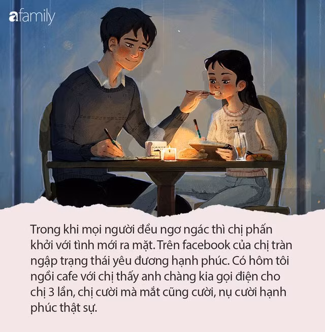 Trong khi mọi người đều ngơ ngác thì chị phấn khởi với tình mới ra mặt. Trên facebook của chị tràn ngập trạng thái yêu đương hạnh phúc.