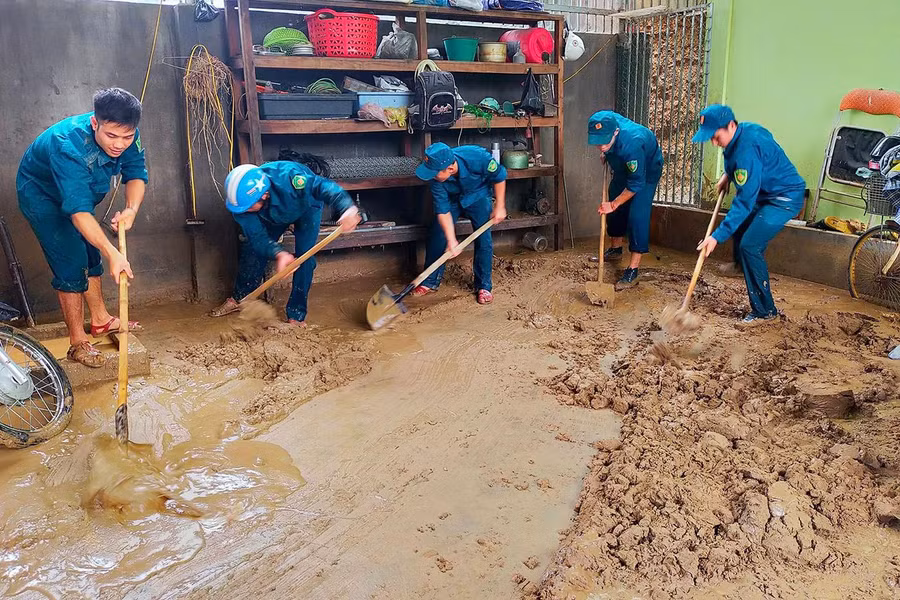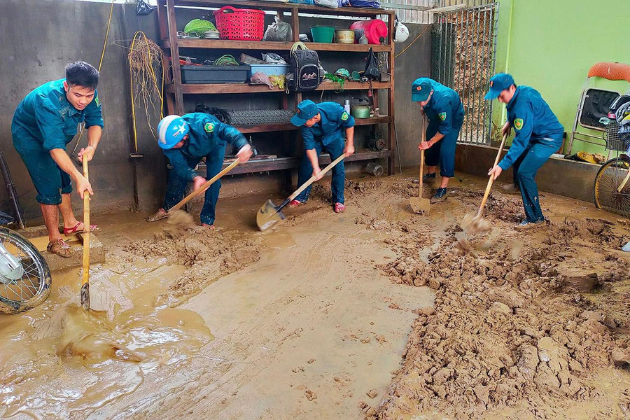 | Bộ đội và dân quân giúp đỡ người dân dọn bùn đất ra khỏi nhà, đồng thời thu dọn đồ đạc sót lại sau trận lũ quét. |