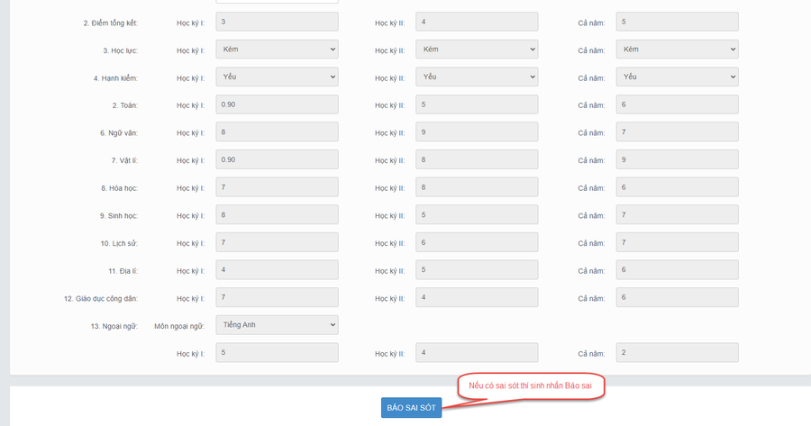 Bước 3: Sau khi xem điểm học bạ nếu thí sinh thấy có sai sót thì nhấn Báo sai sót (Lưu ý: Nút báo sai sót sử dụng để báo sai sót cho cả 3 năm học. Nếu thí sinh thấy có sai sót cả 3 năm học thì thực hiện báo sai sót cùng 1 lần):