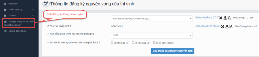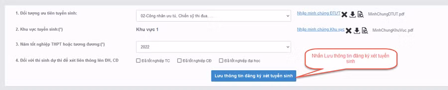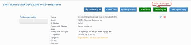 Bước 7: Nhấn Lưu thông tin đăng ký xét tuyển sinh: