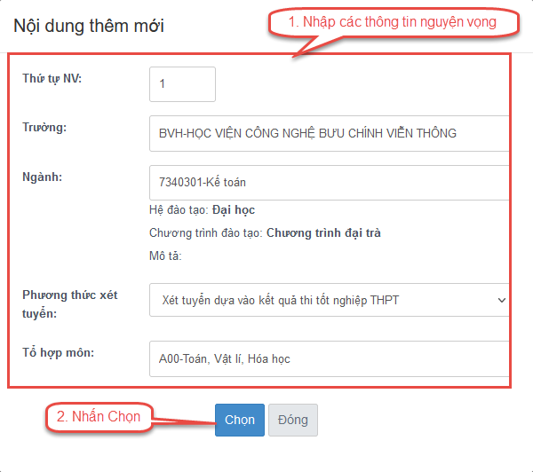 Bước 2: Thí sinh thực hiện nhập các thông tin nguyện vọng bao gồm Thứ tự NV, Trường, Ngành, Phương thức xét tuyển, Tổ hợp môn => Sau đó nhấn Chọn để thêm nguyện vọng