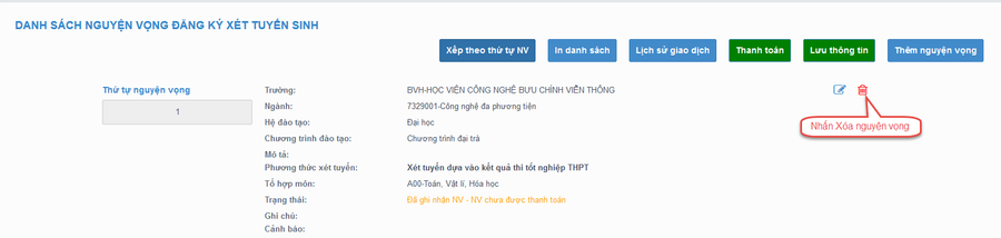 Bước 1: Nhấn Xóa nguyện vọng tại nguyện vọng cần xóa: