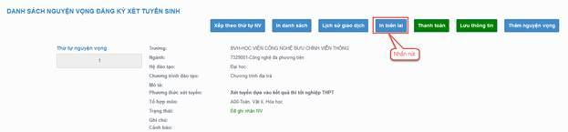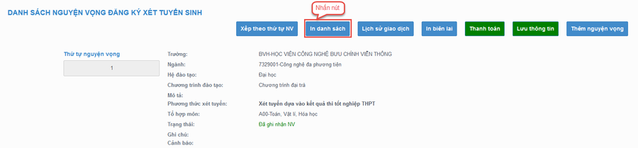 Thí sinh nhấn In danh sách để thực hiện in danh sách các nguyện vọng: