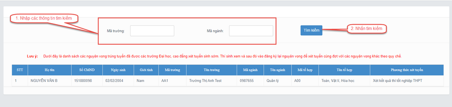 Bước 2: Thí sinh có thể tìm kiếm theo Mã trường, Mã ngành bằng cách nhập các thông tin vào và nhấn tìm kiếm: