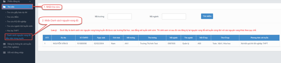 Đối với danh sách nguyện vọng đủ điều kiện trúng tuyển