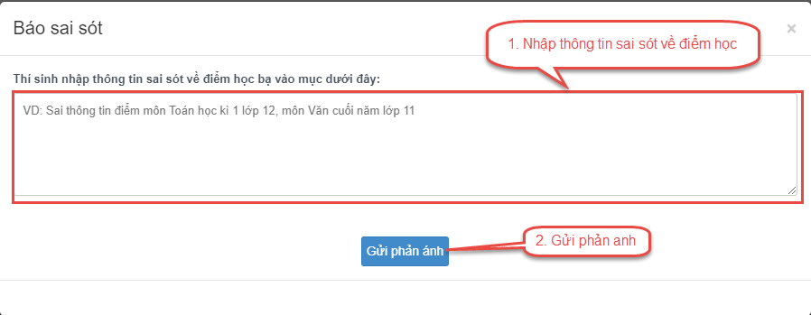 Bước 4: Sau khi nhấn Báo sai sót sẽ hiển thị màn hình để thí sinh nhập thông tin sai sót. Thí sinh nhập ví dụ: Sai thông tin Học lực học kì 1, Sai thông tin điểm môn Toán học kì 1 lớp 12, môn Văn cuối năm lớp 11. Sau đó nhấn Gửi phản ánh: