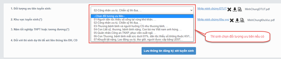 Bước 2: Chọn đối tượng ưu tiên tuyển sinh nếu có: