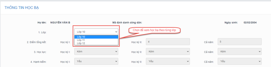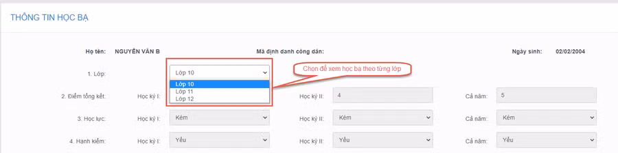 Bước 2: Thí sinh thực hiện xem điểm học bạ, Nhấn vào lớp chọn Lớp 10, Lớp 11, Lớp 12 để xem học bạ các năm học: