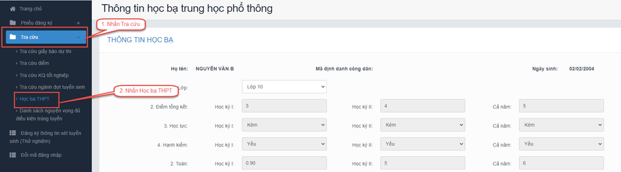 Bước 1: Thí sinh đăng nhập vào thệ thống => Nhấn Tra cứu => Nhấn Học bạ THPT: