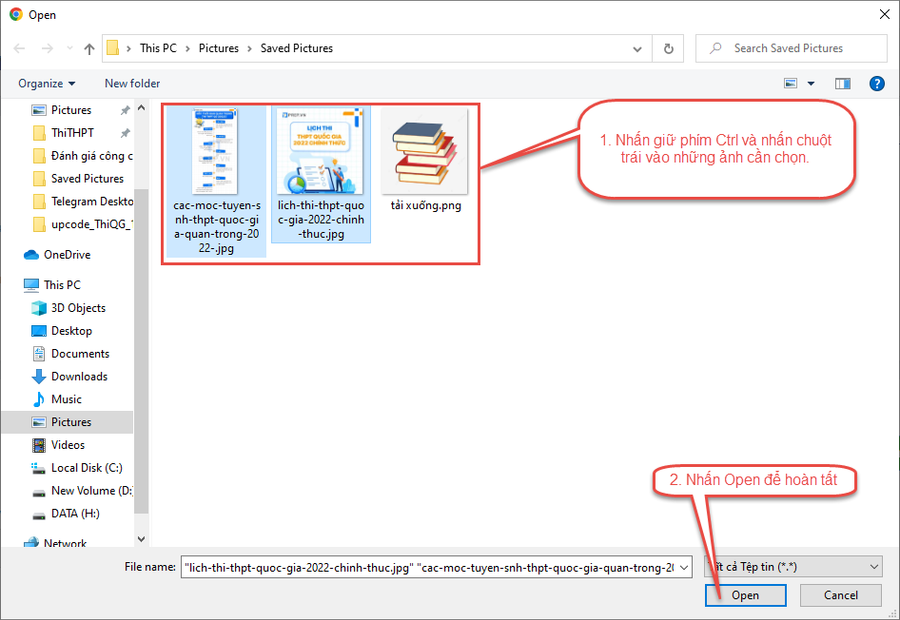 Bước 6: Màn hình chọn ảnh hiển thị. Nhấn giữ phím “Ctrl” trên bàn phím và nhấn chuột phải vào các ảnh cần chọn (những ảnh được chọn sẽ hiển thị được bôi đen) sau khi chọn ảnh xong thí sinh nhấn Open để tải ảnh lên:
