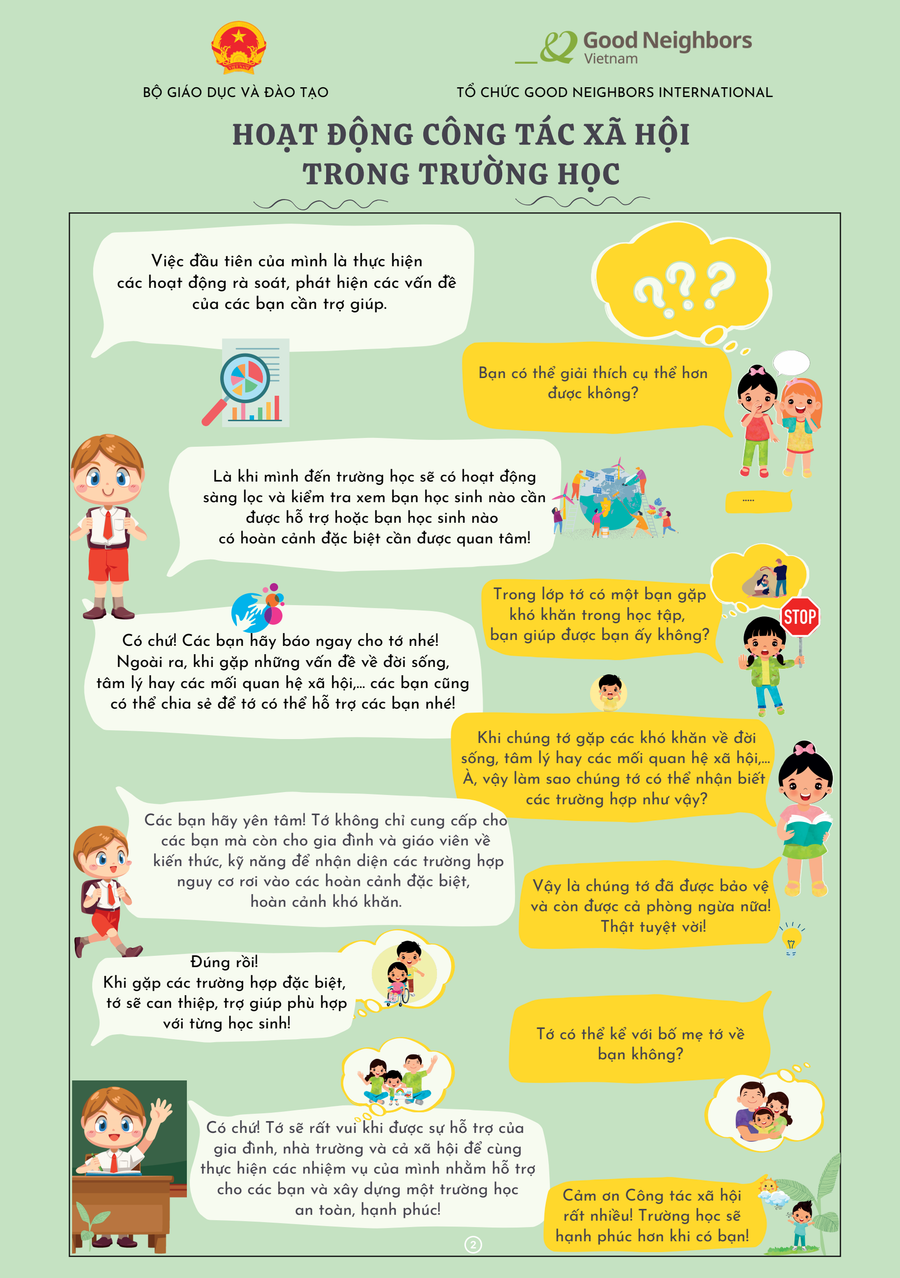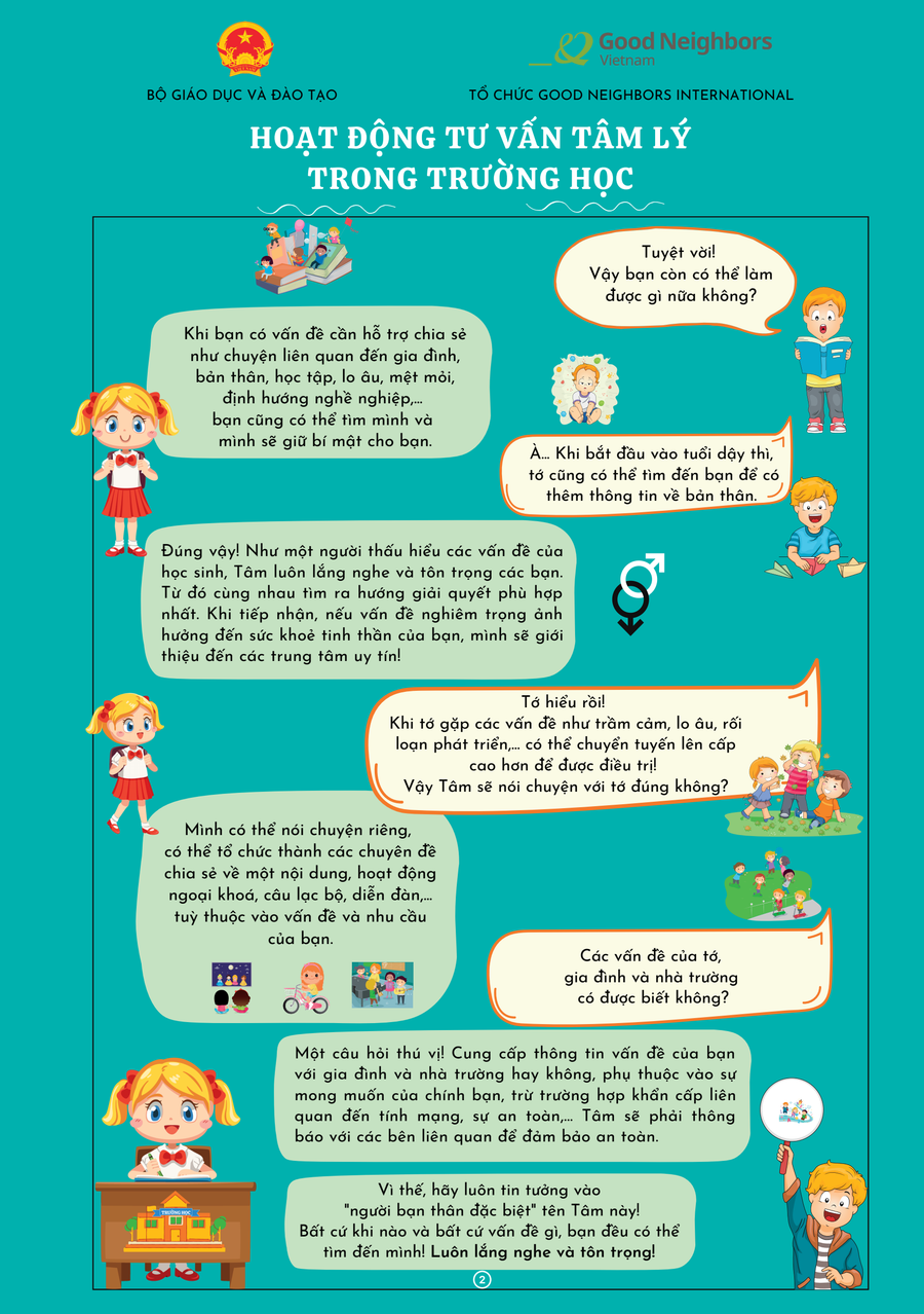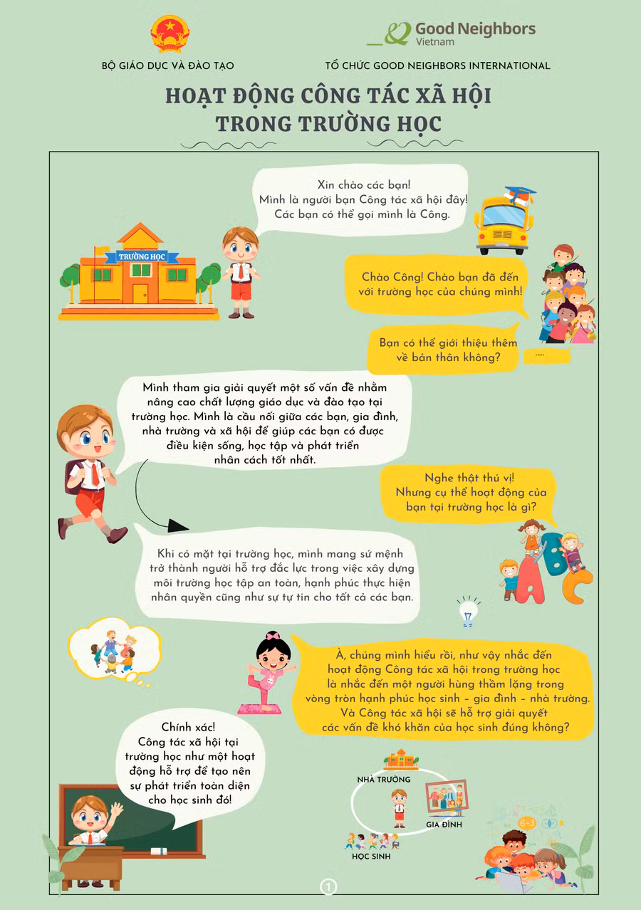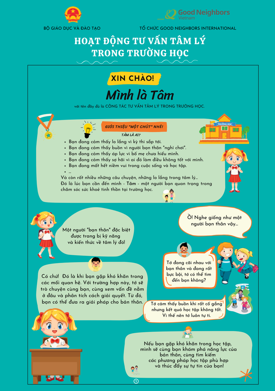 Thực hiện phối hợp giữa Bộ GD&ĐT và Tổ chức Good Neighbors International (GNI), Bộ GD&ĐT đã xây dựng Tờ rơi truyền thông về công tác xã hội và tư vấn tâm lý trong trường học (Tờ rơi truyền thông) với mục đích truyền thông nâng cao nhận thức về công tác xã hội và tư vấn tâm lý trong trường học cho cán bộ quản lý, giáo viên, học sinh và cha mẹ học sinh.