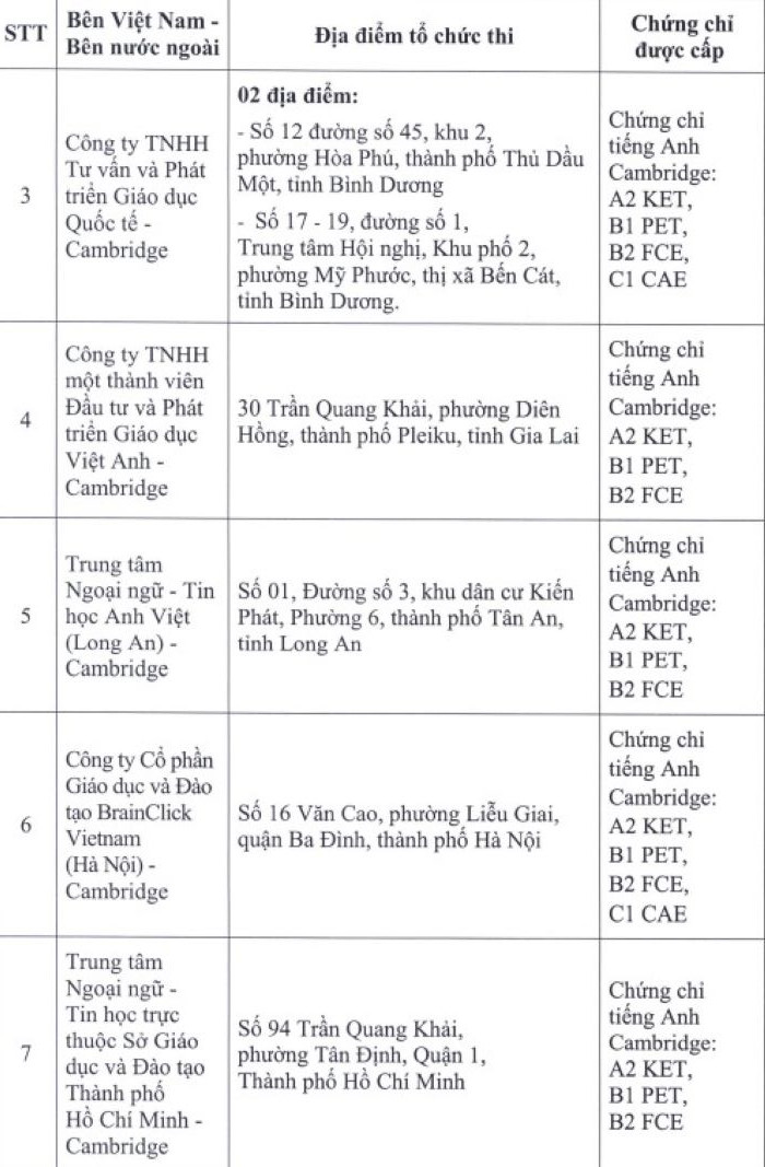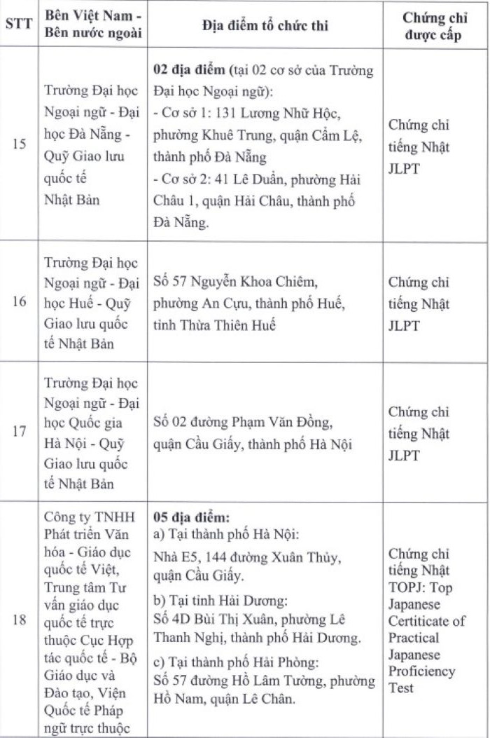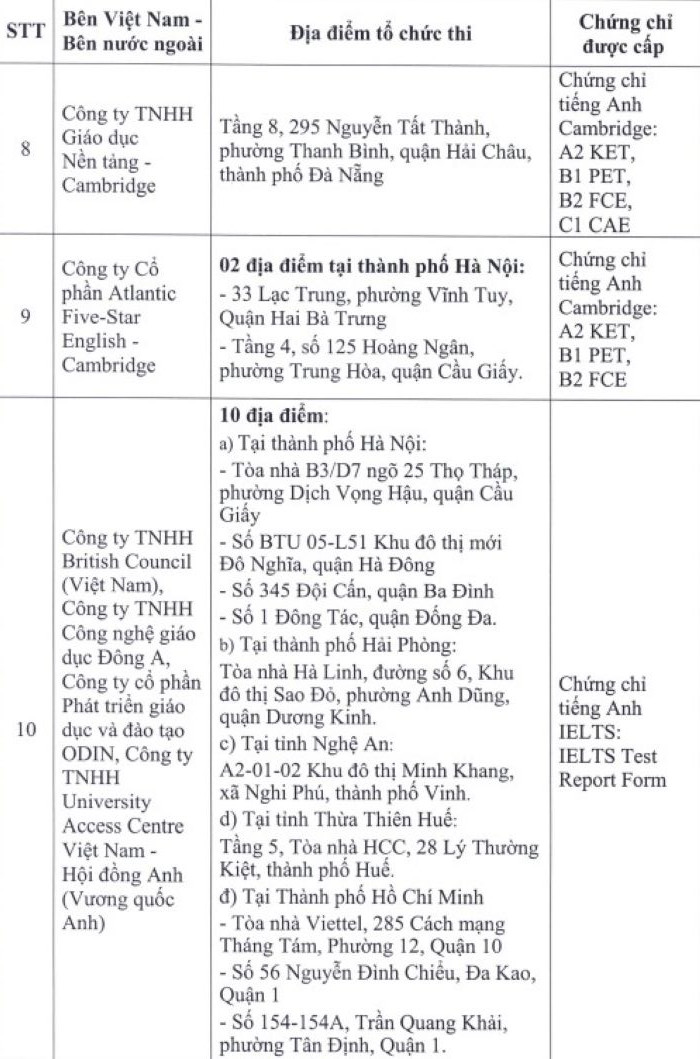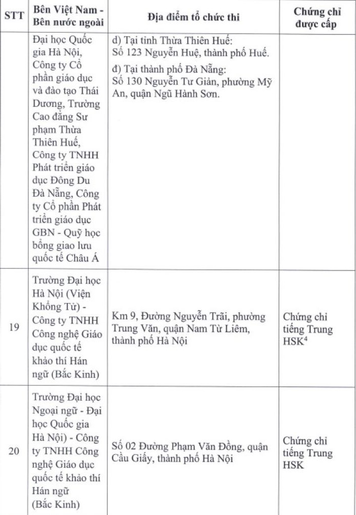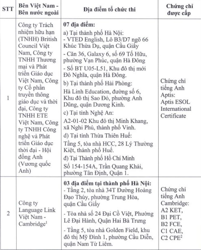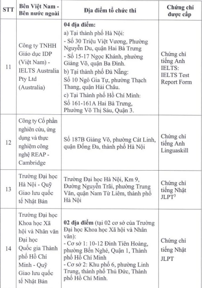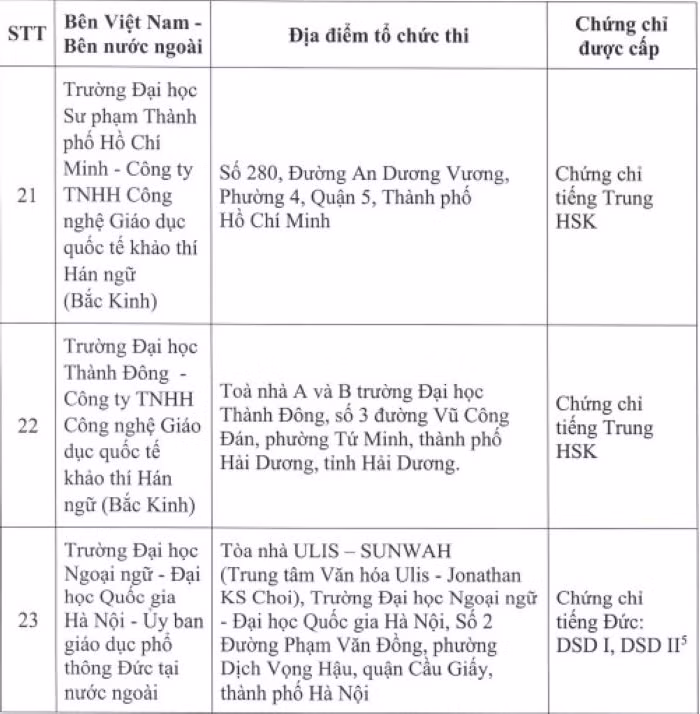 Cu thể, tổng số có 23 đơn vị được liên kết thi, cấp chứng chỉ năng lực ngoại ngữ như sau: