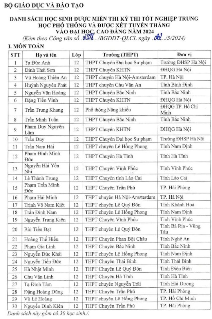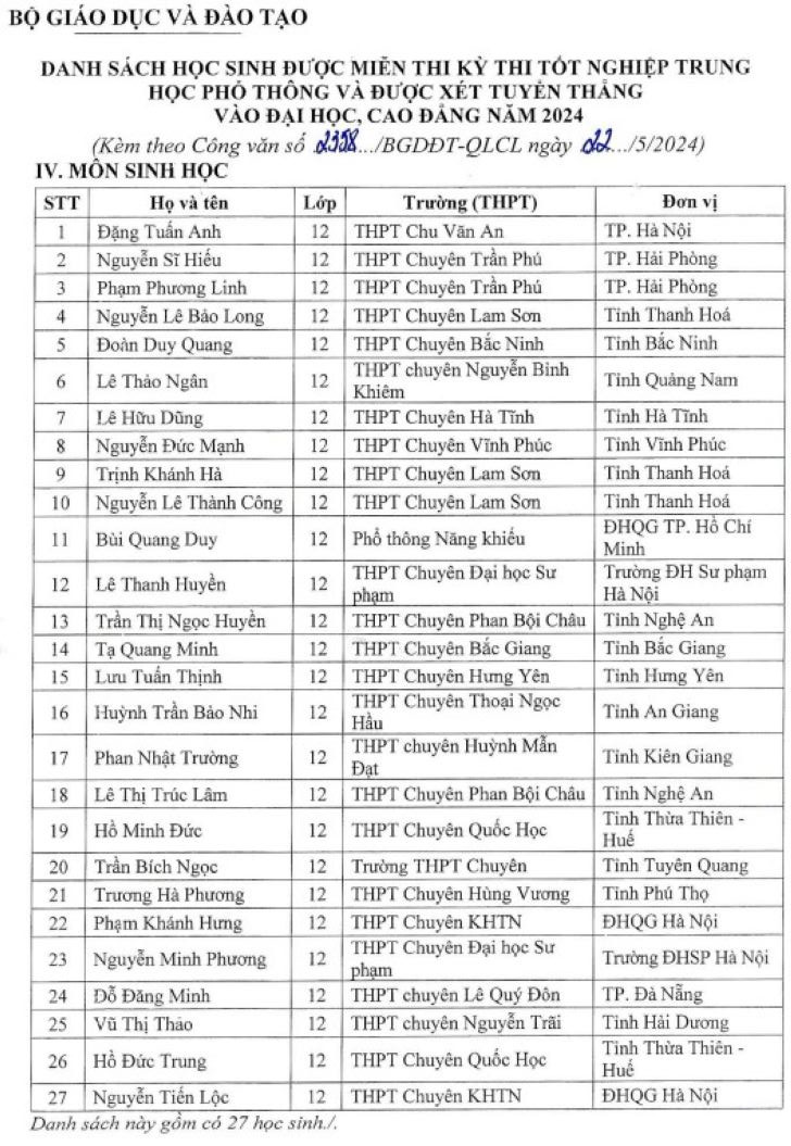 Bộ GD&ĐT đề nghị các sở GD&ĐT thực hiện việc miễn thi Kỳ thi tốt nghiệp THPT năm 2024 theo quy định tại khoản 1 Điều 36 của Văn bản hợp nhất số 01/VBHN-BGDĐT ngày 22/4/2024 của Bộ trưởng Bộ GD&ĐT đối với các thí sinh có tên trong danh sách.