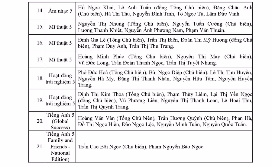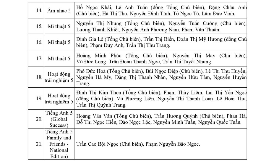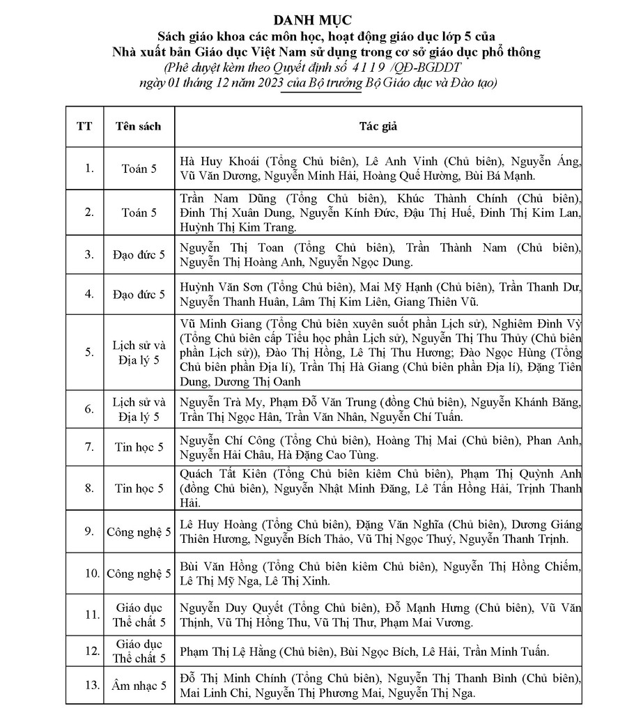 Sau thời gian dài nỗ lực, khẩn trương triển khai thực hiện công tác biên soạn, biên tập sách giáo khoa của lớp 5, các đầu sách giáo khoa của Nhà xuất bản Giáo dục Việt Nam đã được Bộ trưởng Bộ GD&ĐT Nguyễn Kim Sơn phê duyệt. Cụ thể như sau: