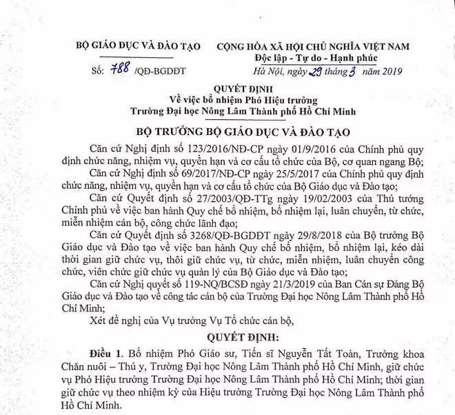 Đồng thời, cùng ngày Bộ trưởng cũng đã bổ nhiệm PGS.TS Nguyễn Tất Toàn- Trưởng khoa Chăn nuôi- Thú y Trường ĐH Nông Lâm TPHCM giữ chức hiệu phó nhà trường.
