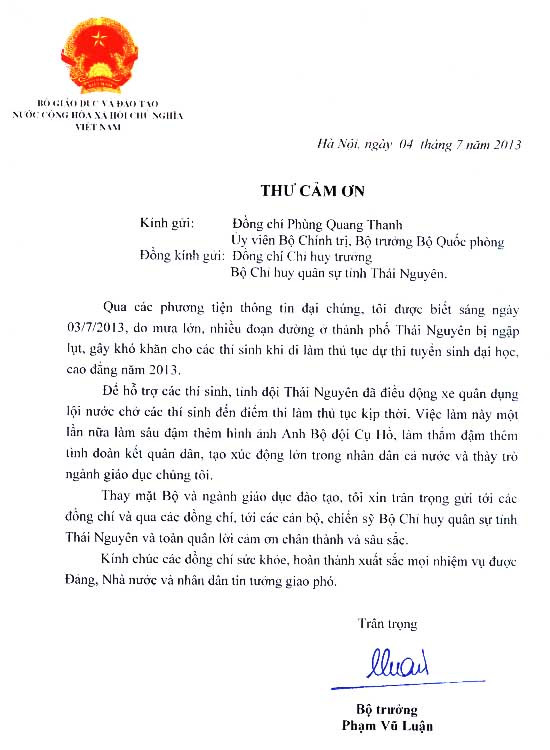 Nhận được thông tin tỉnh đội Thái Nguyên đã điều động xe quân dụng lội nước chở các thí sinh đến điểm thi làm thủ tục kịp thời, hôm nay (4/7), Bộ trưởng Bộ GD&ĐT Phạm Vũ Luận đã gửi thư cảm ơn tới các đồng chí Phùng Quang Thanh - Ủy viên Bộ Chính trị, Bộ trưởng Bộ Quốc phòng; đồng chí chỉ huy trưởng Bộ Chỉ huy Quân sự tỉnh Thái Nguyên và thông qua các đồng chí, Bộ trưởng Phạm Vũ Luận cũng gửi tới các cán bộ, chiến sỹ Bộ Chỉ huy Quân sự tỉnh Thái Nguyên và toàn quân lời cảm ơn chân thành và sâu sắc nhất.