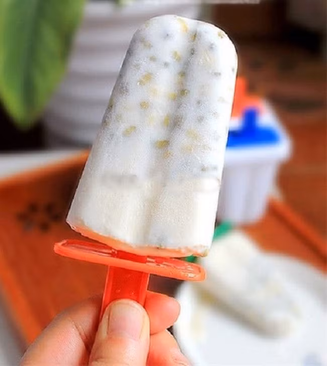 6, Rót hỗn hợp vào khuôn làm kem, để vào ngăn đá tủ lạnh khoảng 2 tiếng là có thể lấy ra thưởng thức.