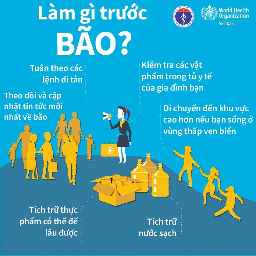Cụ thể, trước cơn bão, cần tuân theo các lệnh di tản, kiểm tra các vật phẩm trong tủ y tế của gia đình bạn, di chuyển tới khu vực cao hơn nếu bạn sống ở vùng thấp ven biển, tích trữ thực phẩm có thể để lâu được, tích trữ nước sạch, theo dõi và cập nhật tin tức mới nhất về bão.
