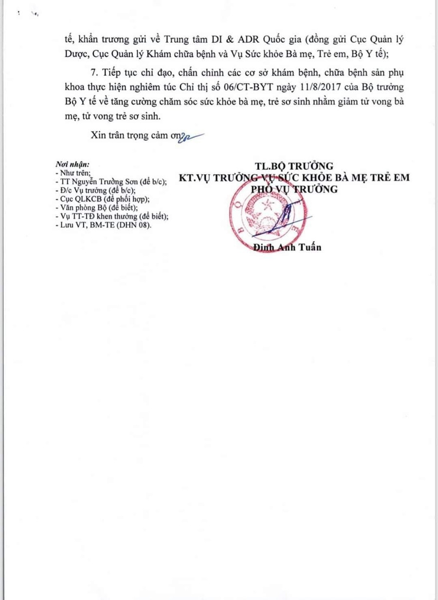 Trong trường hợp nghi ngờ nguyên nhân tử vong có liên quan đến thuốc sử dụng trong qua trình điều trị cho các sản phụ, Sở Y tế phải báo cáo phản ứng có hại của thuốc và gửi về Trung tâm DI & ADR Quốc gia, Cục Quản lý Dược, Cục Quản lý Khám, chữa bệnh và Vụ Sức khỏe Bà mẹ - Trẻ em.
