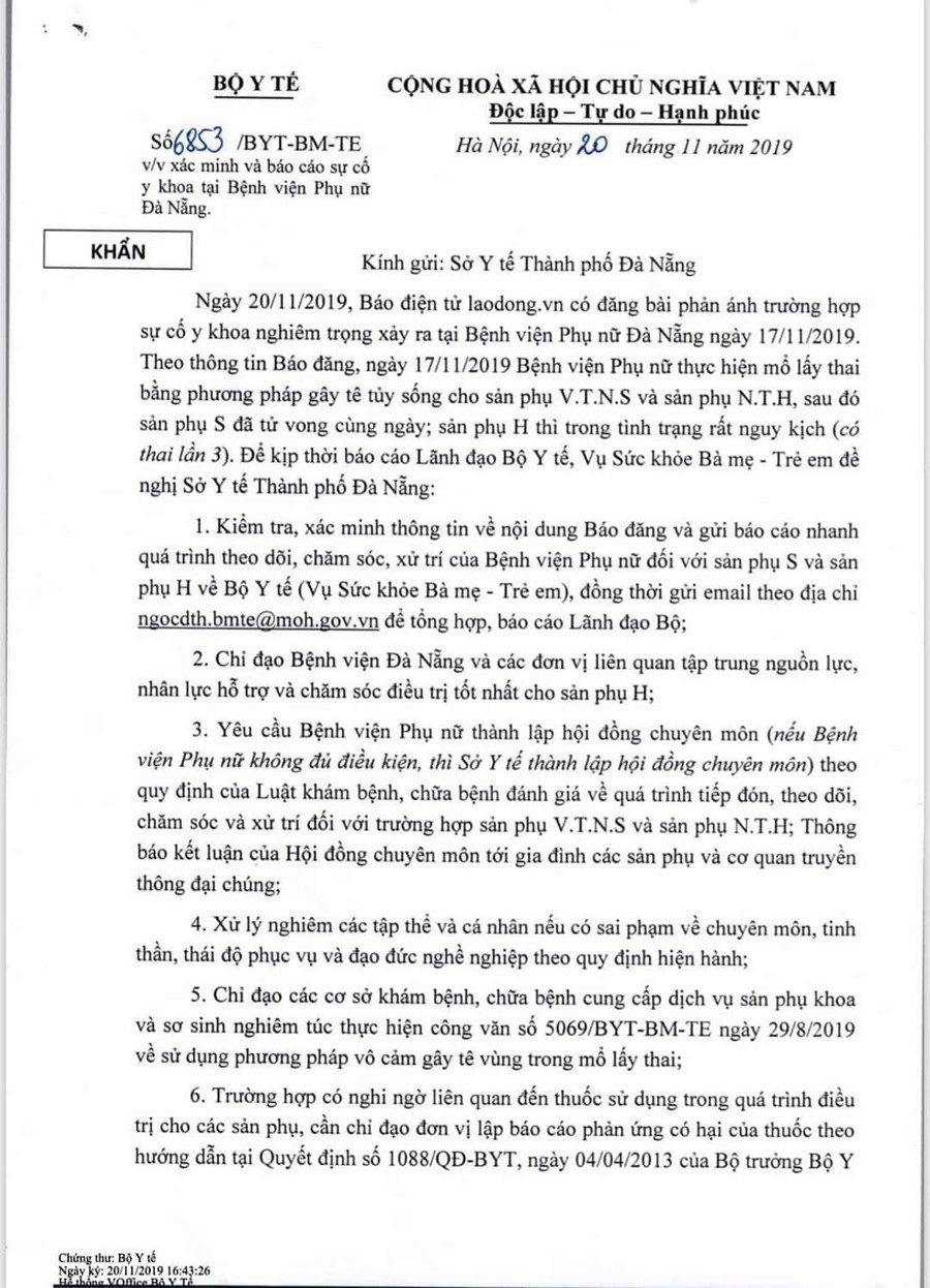 Bộ Y tế yêu cầu Sở Y tế TP Đà Nẵng kiểm tra, xác minh thông tin về nội dung các Báo đã đăng và gửi báo cáo nhanh quá trình theo dõi, chăm sóc, xử trí của Bệnh viện Phụ nữ đối với 2 sản phụ về Bộ Y tế; Chỉ đạo Bệnh viện Đà Nẵng và các đơn vị liên quan tập trung nguồn lực, nhân lực hỗ trợ và chăm sóc điều trị tốt nhất cho sản phụ đang nguy kịch là N.T.H.