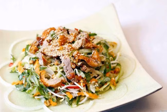 Thịt vịt luộc, ngó sen, cà rốt, bắp cải, lạc rang, làm nộm. Món này tác dụng kiện tỳ dưỡng tâm ích thận, trị chứng mơ màng tiểu dầm rất hiệu quả.