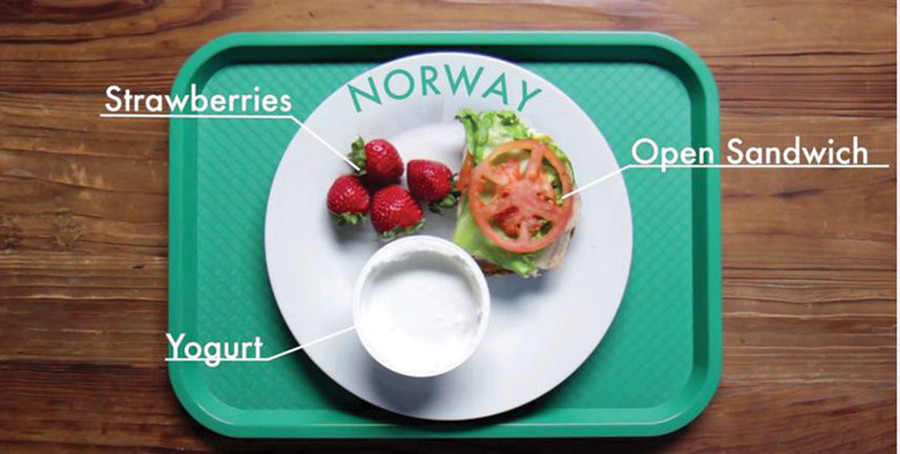 Món ưa thích trong bữa ăn học đường ở Na Uy là bánh “open sandwiches”(sandwich trần), bao gồm bánh mì, cà chua, xà lách và thịt nguội. Món này thường đi kèm với sữa chua và trái cây (dâu tây hoặc nho).