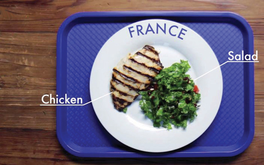 Bữa trưa trong trường học ở Pháp thường bao gồm ức gà nướng, xà lách hoặc bánh mì và pho mát. Điều đáng chú ý là trong các nhà trường không có máy tự động bán bánh kẹo hoặc nước ngọt có ga.