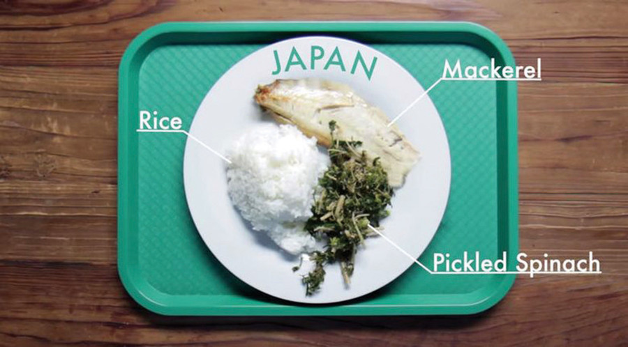 Trên các khay đựng đồ ăn trưa trong nhà trường thường xuất hiện cá thu, cơm và rau bina.