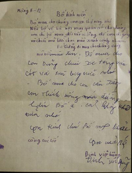 Bố mua cho chúng con các thứ này nhé. Nếu bố về Hà Nội mua quần áo cho chúng con thì bố mua đôi tất ni lông để con đi giầy và chiếc mũ lưỡi chai (trai) mầu xanh công nhân. Bố Tưởng ơi mua cho thằng Dũng mũ nồi mầu đen. Bố mua cho con Dũng chiếc xe tăng vặn cót và tàu bay nữa nhé. Bố mua cho con cân đường. Con thích uống nước đường lắm bố ạ. Cả lương khô nữa nhé.