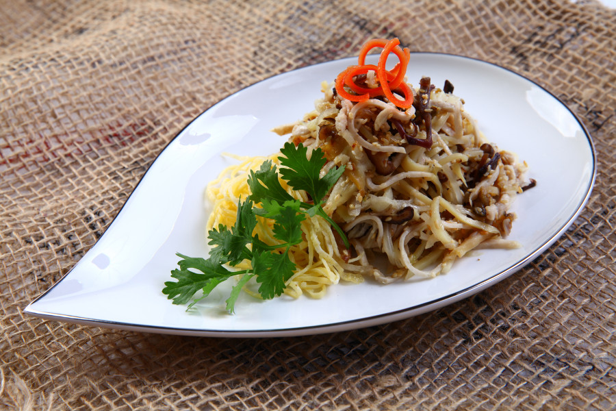 Cho bún tươi, nấm mèo, nấm đông cô, chả lụa vào tô, trộn đều. Nêm muối, bột ngọt cho vừa ăn.
