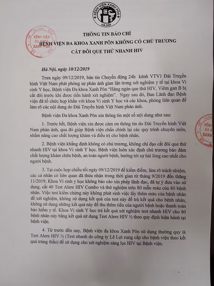 Theo đó, ngay sau khi nhận được phản ánh, Bệnh viện Đa Khoa Xanh Pôn đã tổ chức cuộc họp để kiểm điểm, làm rõ trách nhiệm, các cá nhân có liên quan đã thừa nhận trong thời gian từ tháng 9/2019 đến tháng 11/2019, khoa Vi sinh y học không báo cáo xin phép lãnh đạo đã tự ý đưa vào sử dụng, cắt 40 Test Alere HIV Combo và thử nghiệm trên 80 mẫu máu của 80 bệnh nhân.