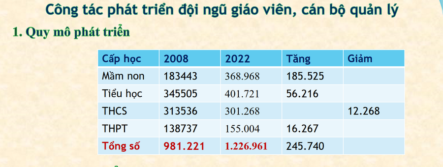 Báo cáo tham luận tại Hội nghị tổng kết 15 năm thực hiện Nghị quyết 27–NQ/TW ngày 6/8/2008 của Ban Chấp hành Trung ương Đảng khóa X (Nghị quyết 27–NQ/TW) về xây dựng phát triển đội ngũ trí thức trong thời kỳ đẩy mạnh công nghiệp hóa, hiện đại hóa đất nước, ông Vũ Minh Đức – Cục trưởng Cục Nhà giáo và Cán bộ quản lý giáo dục (Bộ GD&ĐT) – cho biết: Quy mô phát triển giáo viên, cán bộ quản lý như sau: